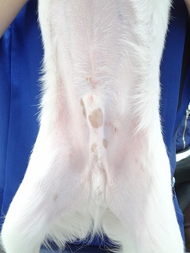 術後1週間後に抜糸を行った様子です。手術前に毛刈りしたところも産毛が生えはじめています。